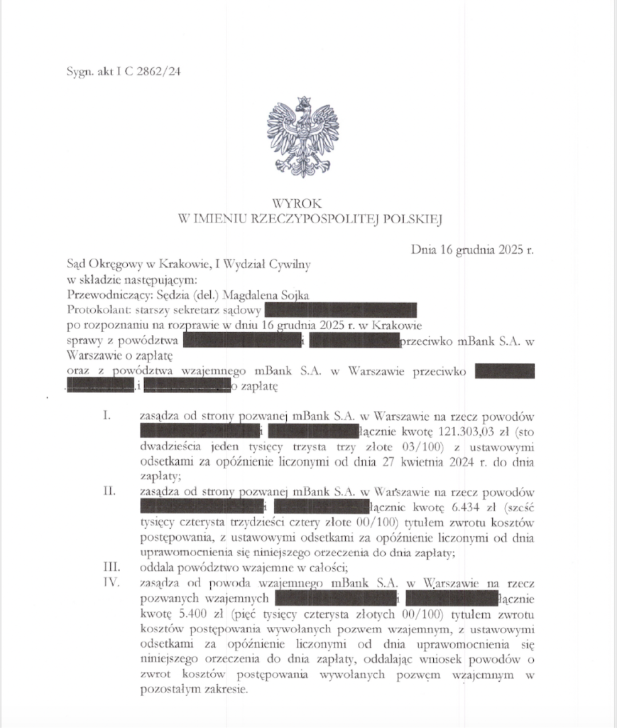 Zasądzenie od mBank S.A. na rzecz kredytobiorców kwoty 121 303,03 zł wraz z ustawowymi odsetkami za opóźnienie oraz zwrot kosztów postępowania. Sąd oddalił w całości powództwo wzajemne banku i obciążył bank kosztami procesu z powództwa wzajemnego. Bank pozwał Klientów pomimo uprzedniego rozliczenia się z kwoty kapitału w drodze potrącenia. Sprawa dotyczy kredytu spłaconego w całości.
