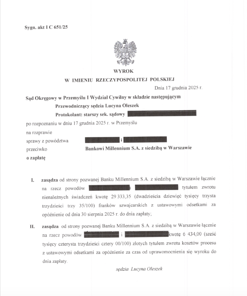 Zasądzenie od Banku Millennium S.A. na rzecz kredytobiorców kwoty 29 333,35 CHF tytułem zwrotu nienależnych świadczeń z uwagi na nieważność umowy kredytu oraz zwrot kosztów procesu. Kredyt spłacony w całości.