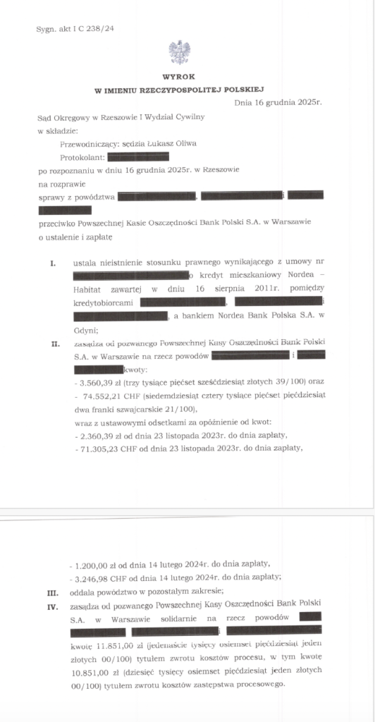 Grudzień 2025 r. przyniósł kolejne korzystne rozstrzygnięcia w sprawach przeciwko bankom prowadzonych przez naszą Kancelarię. Sądy okręgowe w Krakowie, Rzeszowie oraz Przemyślu uwzględniły roszczenia naszych Klientów.