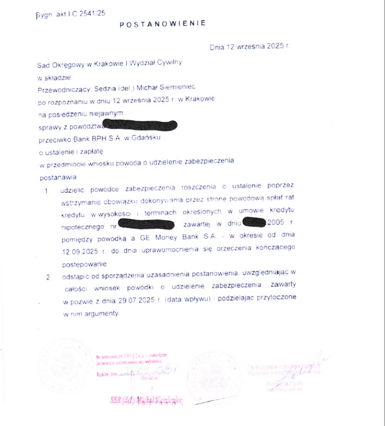 W dniu 12 września 2025 r. Sąd Okręgowy w Krakowie, w sprawie o sygn. akt I C 2541/25 przeciwko Bankowi BPH S.A., udzielił Klientce Kancelarii zabezpieczenia w sprawie frankowej.